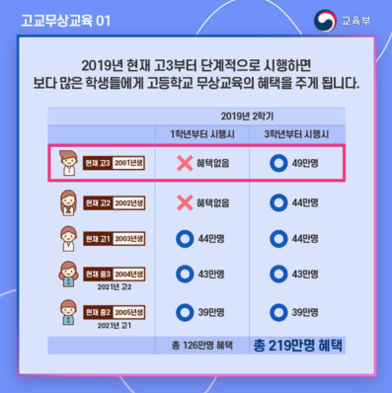 참고해야 할 사항이 있다면 고교 무상교육은 아직 고등학생 1학년 부터 3학년 모두 혜택이 있는 건 아니랍니다. 알려진 바로는 올해 8월 19일부터 실시가 되지만 고등학생 3학년이 해당되며 정확히는 2학기부터 시행이 됩니다. 순차적으로 내년 2020년부터는 고등학생 2학년과 3학년이 고교 무상교육 대상이 되고 다음으로 2021년부터는 1학년을 포함하 전 학년이 대상이 됩니다. 여기서 한 가지 더 좋은 정보를 같이 알려드리자면 2021년부터는 전 학년 중 1학년은 입학금도 면제받습니다.