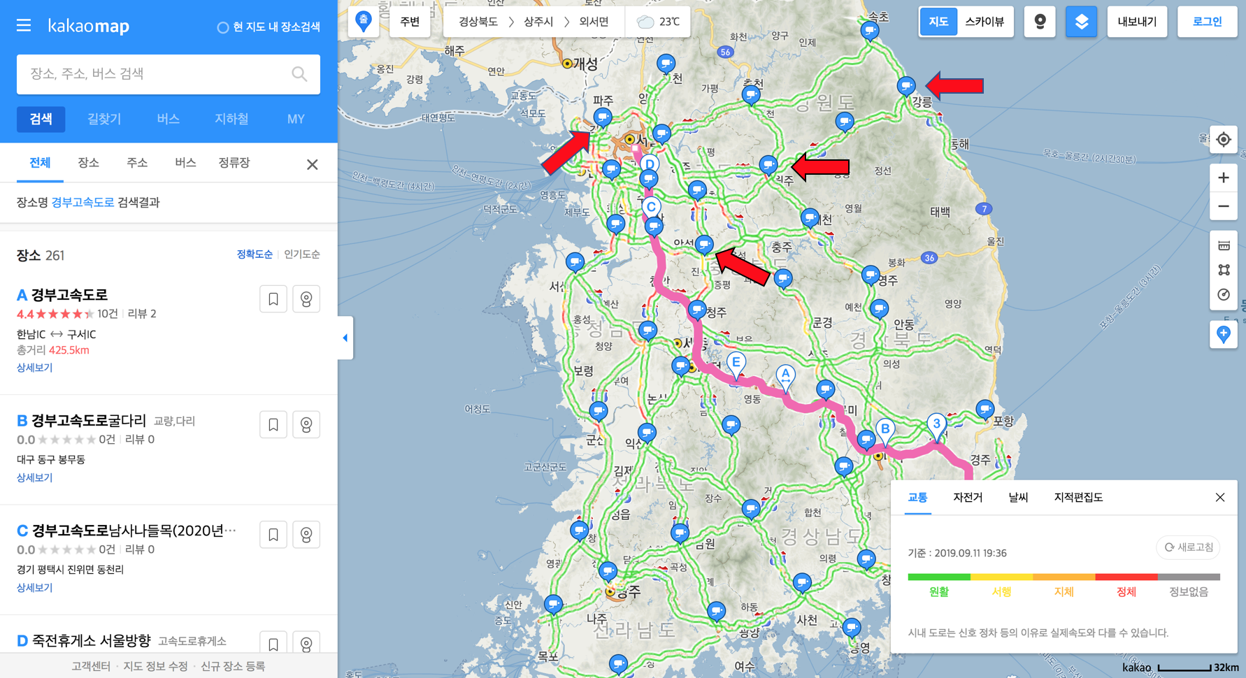 고속도로 교통상황 관련 정보란에 있는 cctv 서울 경기권을 선택한다면, 보이는 페이지는 카카오 맵(kakaomap)이라는 현재 대한민국 고속도로 혹은 국도 등의 교통정보와 교통상황을 실시간 고속도로cctv로 볼 수 있는 사이트를 확인할 수 있었습니다. 위 지도 내에 빨간색 화살표를 주목해주세요. 임시로 4개의 화살표로만 표시를 해두었는데, 파란색으로 되어있는 동그란 것을 가리키고 있습니다. 실시간으로 볼 수 있는 고속도로 cctv 버튼임을 눈치채셨나요? 실제로 저 버튼을 컴퓨터는 마우스 그리고 모바일은 손가락으로 선택해준다면 실시간으로 고속도로 교통상황을 cctv로 확인하고 볼 수 있습니다.