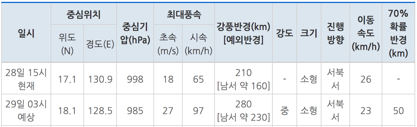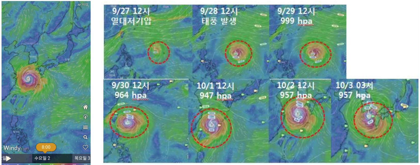 태풍을 처음 발견 했을 당시 발견지역의 중심기압은 1004 hPa였고 최대 풍속은 15m/s이었습니다. 이렇게 시작된 태풍이 지금 우리나라 한반도를 향해 미탁 경로를 틀고 있다니 미리 준비를 해두어야 할 시간입니다.