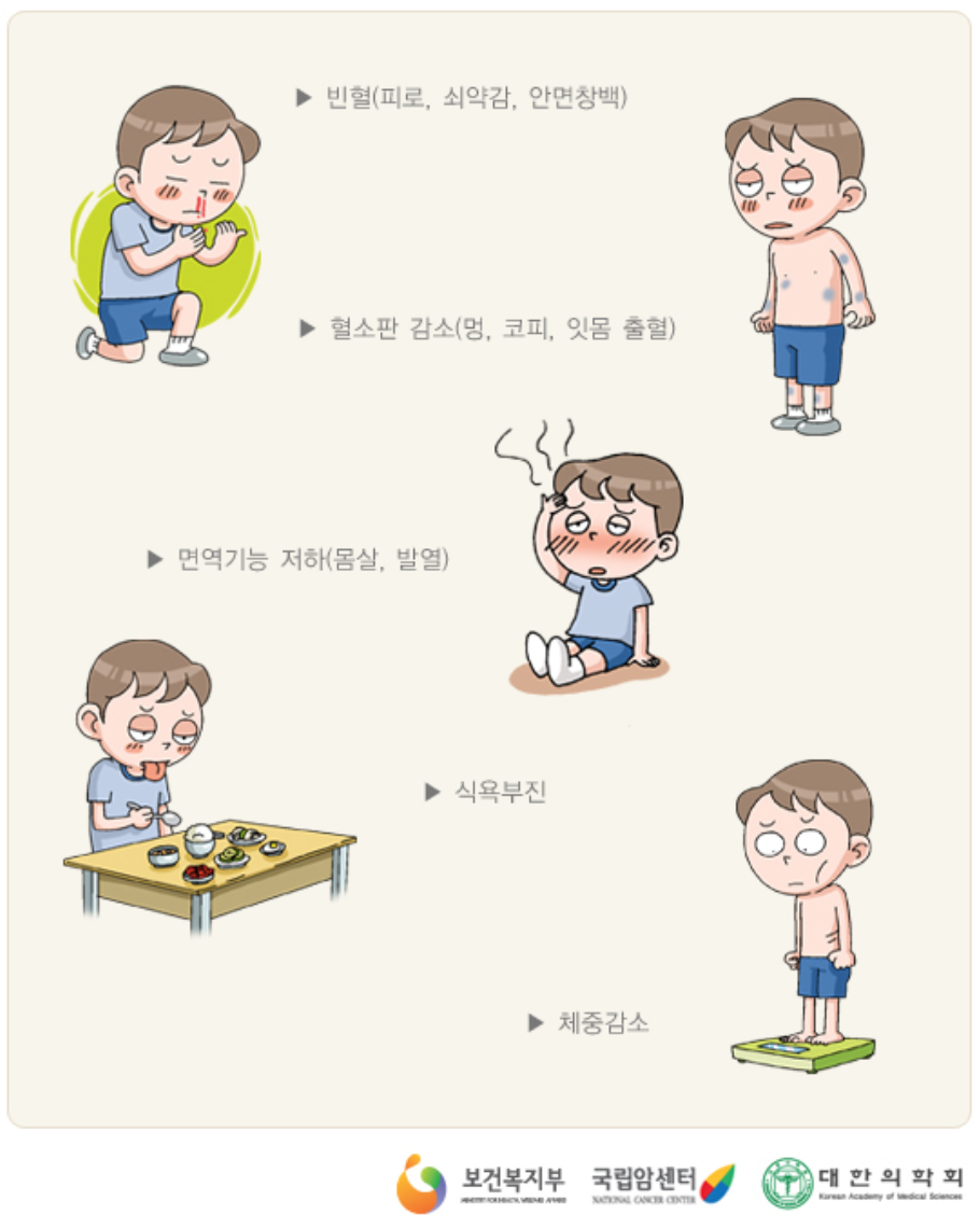 일반적인 증상으로는 급성백혈병 환자 대부분은 공수에서 암세포가 자라 정상 조혈 작용을 억제하며, 조혈을 방해하고 빈혈과 백혈구 감소, 그리고 혈소판 감소가 오게되므로 이로 인한 증상이 나타난다면 병원으로 찾아가야 한답니다.