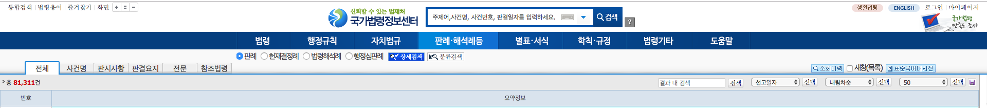 다음으로는 판례와 해석례등 탭을 확인해 보도록 하겠습니다. 판례라는 뜻은 재판에 있어서의 선례를 뜻하는 단어로 선례에 의해 밝혀진 이론과 법칙 그리고 규범과 같은 것을 말합니다. 비슷한 사건에 대한 재판이 누적됨에 따라 일반적인 법리로 발전할 수 있고 추상적인 규범이 형성됨에 있습니다. 판례, 행석례등은 약 8만개 이상 정보가 있습니다.