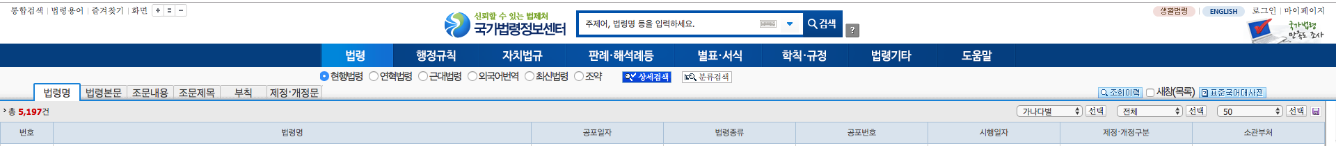 법령탭에 서브카테고리는 현행법령, 연혁법령, 근대법령, 외국어번역, 최신법령, 조약 등을 상세검색과 분류검색을 통해 찾아볼 수 있습니다. 약 5천개 이상의 법령이 있습니다.