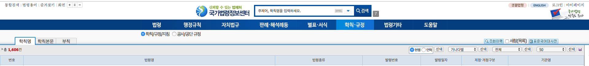 학칙과 규정에는 약 1,600건이 넘는 법령명이 모여있습니다. 각종 대학교에서 나온 규정을 살펴볼 수 있는 카테고리이며, 학칙/규정/지침 그리고 공사와 공단 규정을 알아볼 수 있습니다.