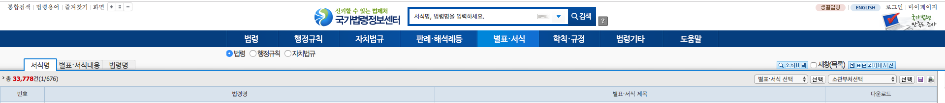 별표, 서식에는 법령과 행정규칙 그리고 자치법규가 약 3만 3천건 이상의 정보가 들어있습니다. 필요에 따라 다운로드를 받아 볼 수 있습니다.