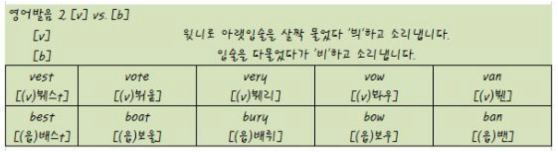 이번에는 'B'와 'V'의 발음 차이를 알아보는 표입니다. 윗니로 아랫입술을 물고 '븨'라는 영어 발음과 입술을 다물었다가 '비'라고 소리 내는 차이를 보여줍니다. 예로 여러 가지 차이점을 확인할 수 있는 단어 또한 같이 보고 연습할 수 있습니다.