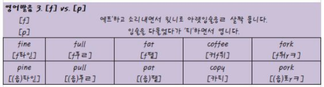 영어 발음 'F'와 'P' 또한 한국어로 발음하자면 비슷한 영어 발음으로 들릴 수 있습니다. '프' 하고 소리 내면서 윗니로 아랫입술을 살포시 물어주며 발음하는 방법과 입술을 다물었다가 '피'하면서 발음하는 차이를 알 수 있습니다.