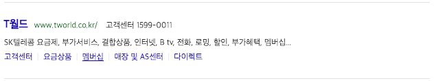 SKT 요금제표를 확인해 보기 위해 t월드를 아무 포털 사이트에서 검색을 했다면, 아래와 같은 검색 결과를 찾아볼 수 있을 것 입니다. t월드 바로가기 탭인데, 우리는 skt요금제 변경 또는 skt요금제표를 확인하기 위해 접속해야 하는 홈페이지이기도 합니다.
