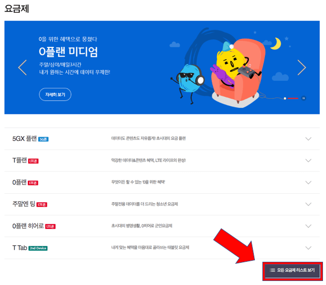 위 이미지에서 제일 아래 보이는 빨간 박스를 집중해보자면, '모든 요금제 리스트 보기'가 있습니다. 그 버튼을 선택해 본다면, 굉장히 많은 skt 요금제표 확인이 가능합니다.