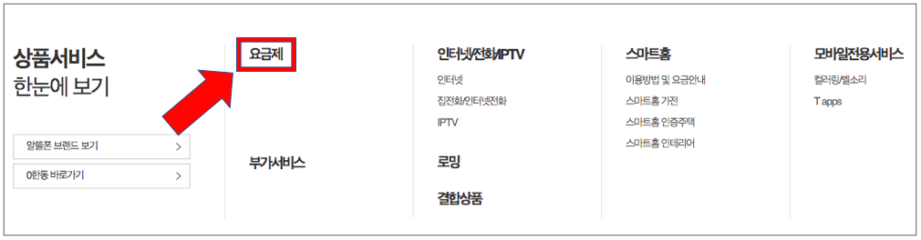 t월드 홈페이지 메인화면 상단에 위치한 카테고리 중 상품서비스 탭을 선택했다면, 아래와 같은 페이지가 로드가 되어 확인할 수 있을 것 입니다.