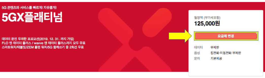 예를 들어 보기 위해서 제일 상단에 있는 5GX플래티넘 요금제를 선택해 보았습니다. 위와 같은 페이지가 결과 값으로 나왔으며, 노란색 박스로 칠해놓은 곳을 확인해 보자면 skt 요금제 변경을 할 수 있는 '요금제 변경' 버튼을 확인할 수있습니다. 이 부분을 선택해 skt 요금제를 집에서도 변경할 수 있다는 점을 알 수 있었습니다.