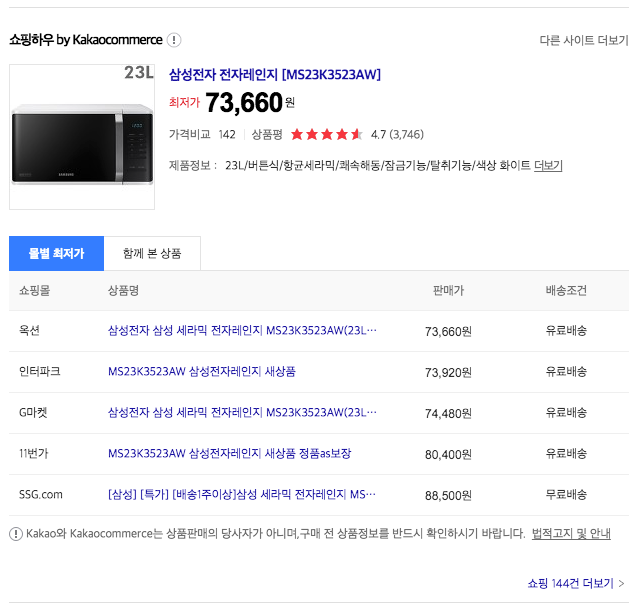 이런식으로 제품번호를 검색해 나타나는 해당 전자렌지의 가격을 쇼핑몰 마다 판매하는 가격을 하눈에 보고 비교할 수 있습니다. 동일한 제품에 대한 가격만 확인할 수 있으며 저렴한 전자렌지는 어떤 것인지 확인한 뒤 해당 상품명을 선택해 자세한 사항을 다시 꼼꼼히 확인하고 구매를 이룰 수 있습니다.