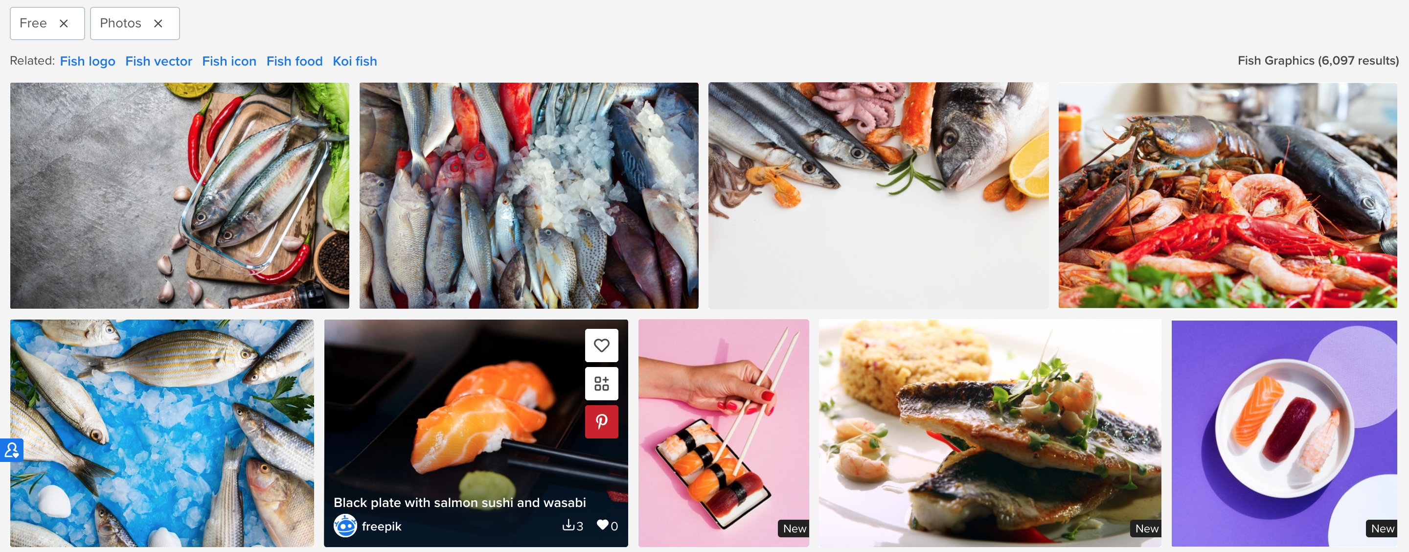 검색창에 'fish'라는 검색으로 나온 결과물들입니다. 필터링으로 무료와 사진을 선택했기 때문에 사진들만 모아 보이는 것으로 보입니다. 약 6천 개 정도의 이미지가 모여있는 것으로 보이며, 본인이 원하는 사진, 이미지를 골라 선택을 해주도록 하겠습니다.