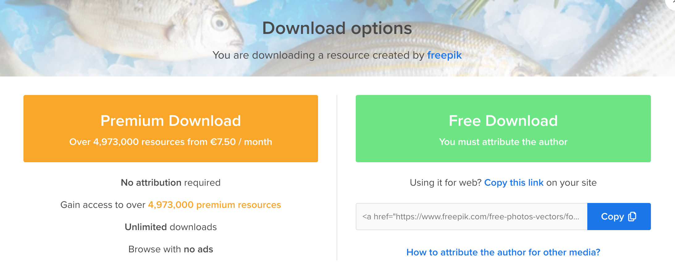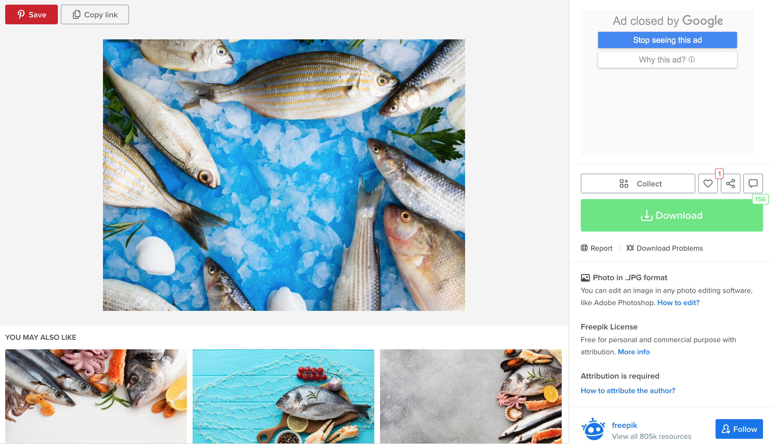 위 물고기 중 이 사진이 마음에 들어 선택을 했다면, 오른쪽 초록색으로 칠해져 위치한 'download'를 선택한다면 다운로드가 다른 조건이 없이 진행될 수 있습니다. 물론 이전에 참고사항으로 본 무료 이미지를 다운로드한 후 지켜야 할 점만 잘 지켜준다면 상업적으로 이용하는 데에는 문제가 되지 않습니다.