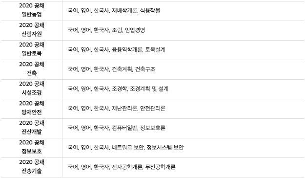기술직이나 공업직, 농업직, 임업직, 시설직, 방재안전직과 전산직 그리고 방통직과 같은 경우에는 선택과목이 없다는 점을 알아두어야 하며, 정해져있는 과목은 총 5과목이 전부라고 합니다.