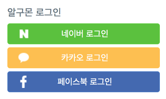 알구몬을 로그인하기 위해서는 네이버, 카카오 그리고 페이스북 로그인이 있습니다.