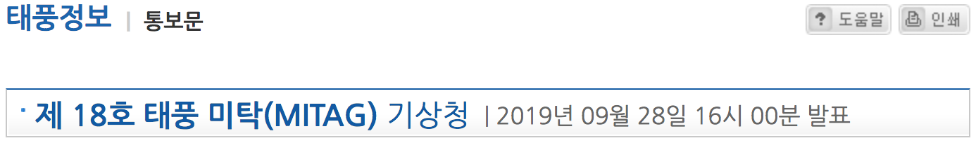 기상청 날씨누리 동네예보 홈페이지를 통하여 이번 2019년 18호 태풍 미탁에 대하여 알아보도록 하겠습니다.