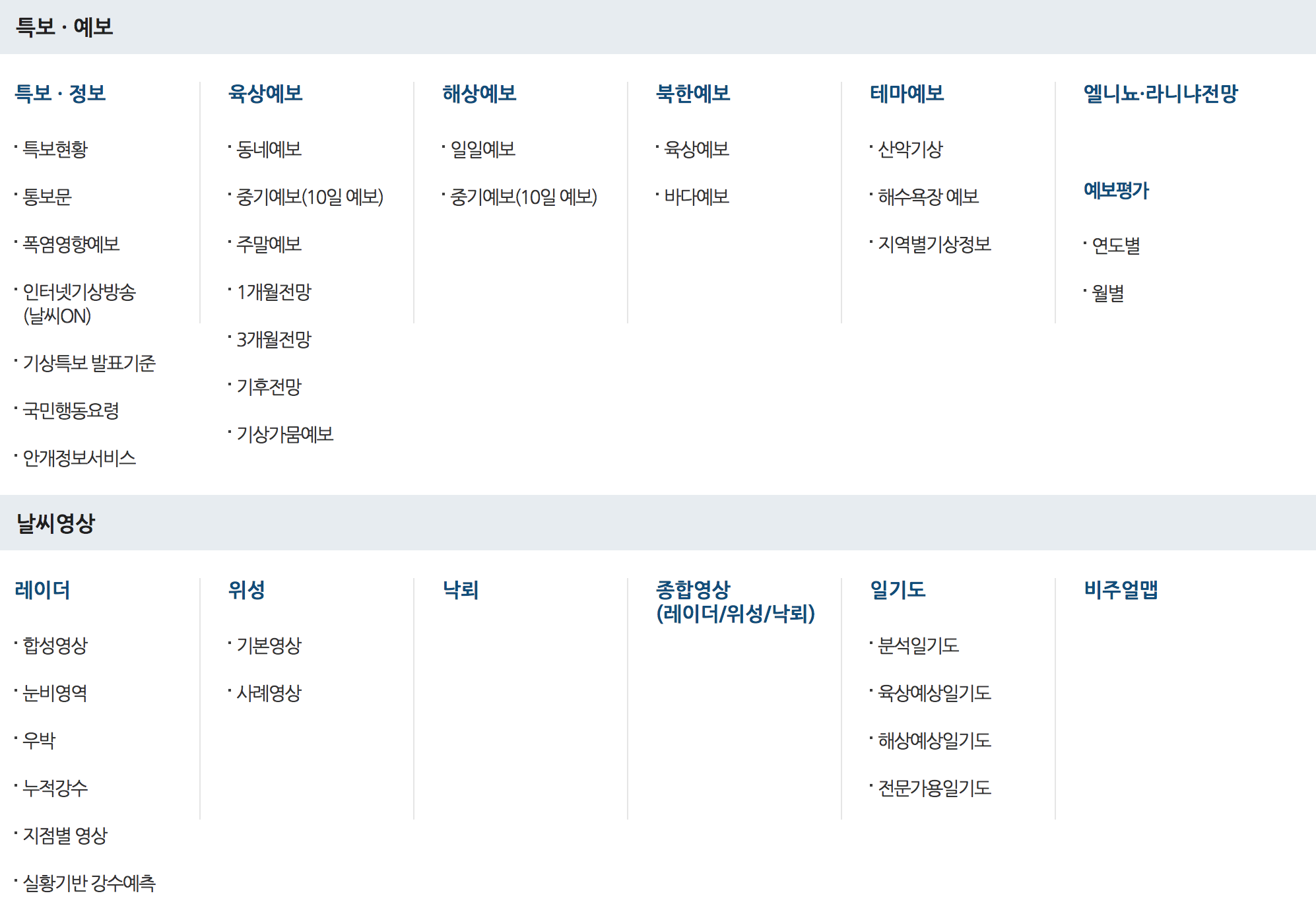 특보, 예보와 날씨 영상에 관한 서브 카테고리입니다. 육상 예보에는 포스트 상단에 말씀드린 동네예보가 있습니다. 날씨 영상에는 레이더, 위성, 낙뢰, 종합 영상, 일기도, 비주얼 맵 등이 배치되어있는 걸 확인할 수 있습니다.