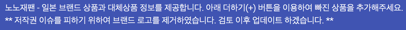 노노재팬 사이트의 설명과 주된 목표를 알 수 있습니다. 일본 브랜드 대체상품 정보 제공 그리고 아래 더하기 버튼을 이용하여 우리들이 모르는 빠진 상품을 추가할 수 있는 내용입니다.